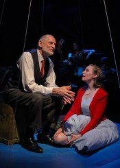 Director Chris Ginesi flips it even further with the non-traditional casting of Orpheus that while seeming to fit Ruhl’s alternative world of raining elevators, a tricycle-riding Lord of the Underworld (Neil Thollander), and a Greek Chorus of Talking Stones (mollie boice, Nick Christenson, Samantha Bolke-Slater), actually detracts from it.