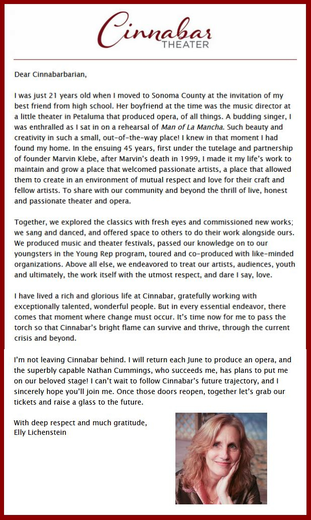 Cinnabar Theater released the following statement this afternoon from Elly Lichenstein regarding her departure as Artistic Director of the theater: