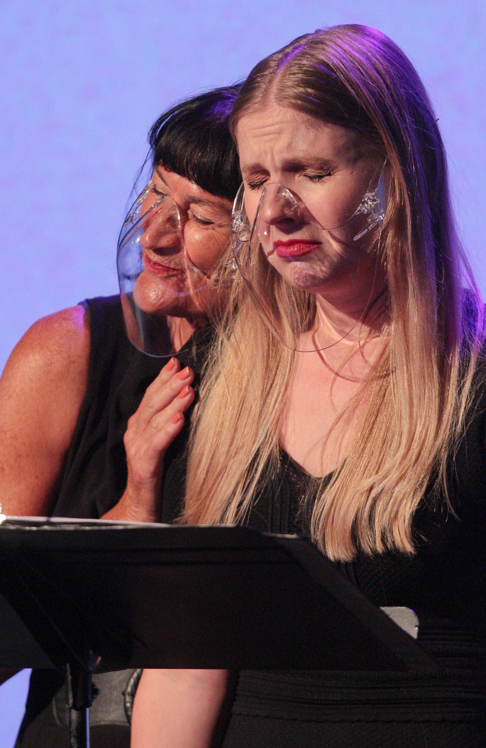 Five stools and five music stands greet you upon entering the theatre. Two projection screens and a single chandelier adorn the back of the stage. Those screens will soon be filled with renderings of the different clothes talked about by the five performers who take the stage – Gillian Eichenberger, Elaine Jennings, Karen Pinomaki, Brittany Nicole Sims, and Jill Wagoner. Sims and Wagoner will be replaced by Heather Gibeson and Daniela Innocenti Beem for the show’s closing weekend.