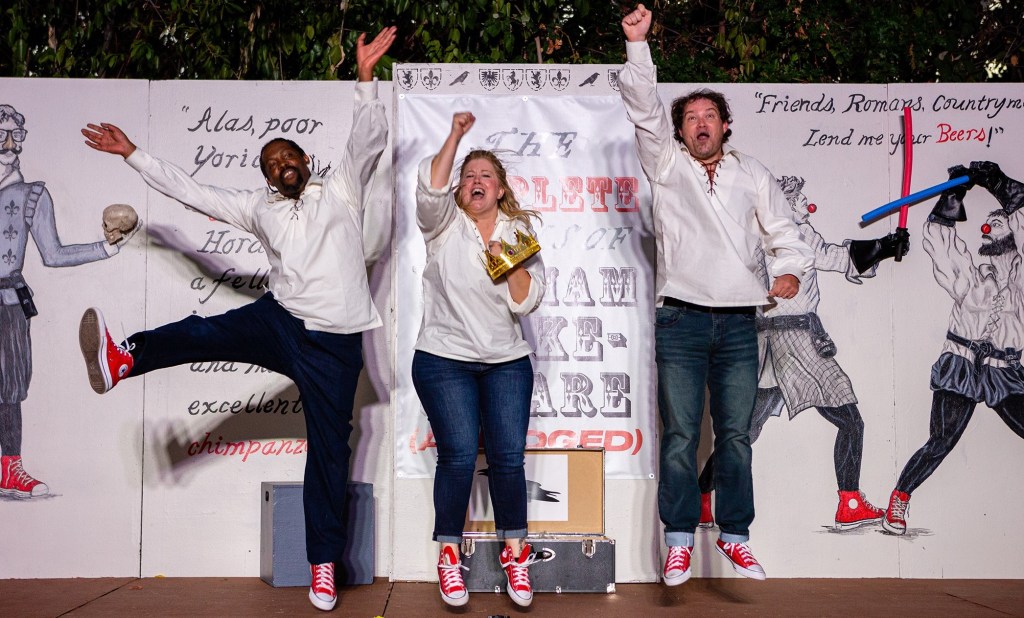 Steven David Martin directs Nicholas Augusta, Matt Farrell, and Katie Watts-Whitaker in The Complete Works of William Shakespeare (Abridged). The premise is simple: three actors compress Shakespeare’s 37 plays down to about two hours (with an intermission.)