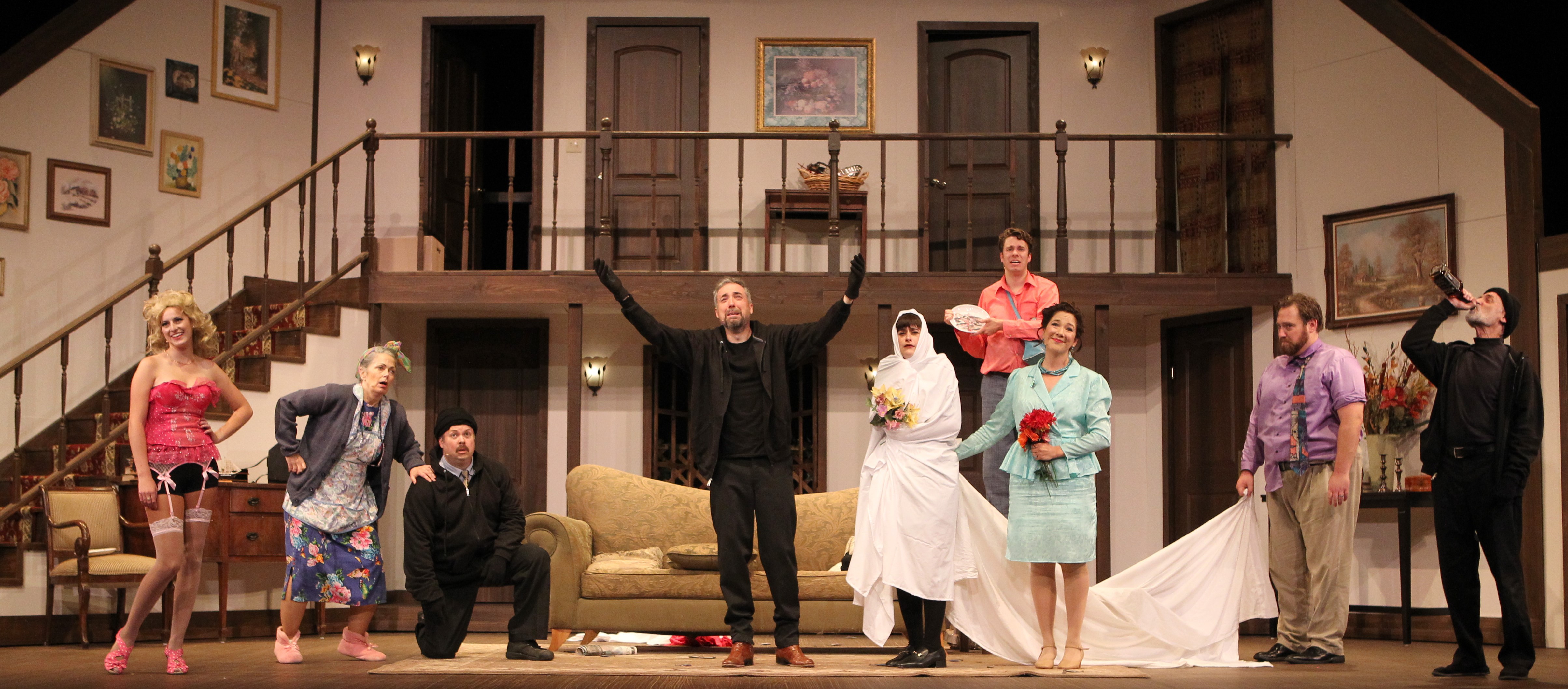 The show(s) are set in the living room of a two-story country home, complete with seven doors (to be slammed), a staircase (to be tumbled down), and plates and plates of sardines (to be slipped upon.)