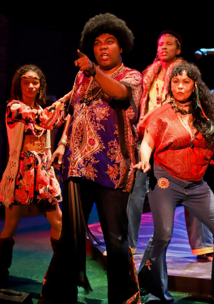 Berger (Ezra Hernandez) pines for a 16-year-old virgin (“Donna”). The tribe sings of a variety of drugs (“Hashish”). Woof (Noah Sternhill) croons about “Sodomy”. Hud (Jourdán Olivier-Verdé) defiantly delivers a series of ugly racial epithets (“Colored Spade”) that elicited gasps, but don’t worry folks, you’ll hear “Good Morning, Starshine” and “Let the Sunshine In” by the show’s end.