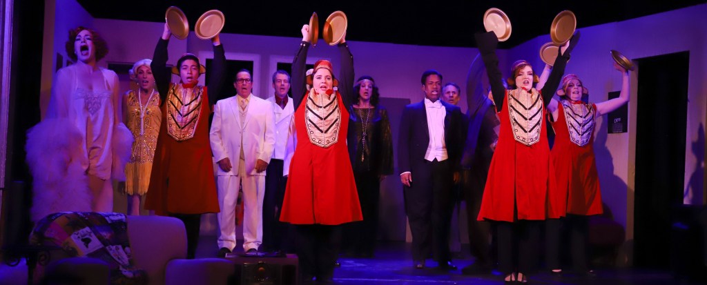 Despite its opening line, Chaperone is a love letter to musical theatre. There’s singing, dancing, comedy, colorful period costuming by Rebecca Valentino and just a wee bit of heart. Director Michael Ross shows a sure comedic hand in guiding his cast in threading the needle between loving parody and outright spoof.