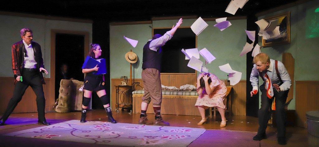 The game’s afoot as the cast gamely marches on despite every possible thing that can go wrong going wrong. Scenery mishaps, misplaced props, bobbled lines, an inebriated tech operator (Reilly Milton), and a stage-shy (then stage struck) stage manager (Denise Elia-Yen) are all obstacles to be overcome in honor of the age-old idiom that the show must go on!