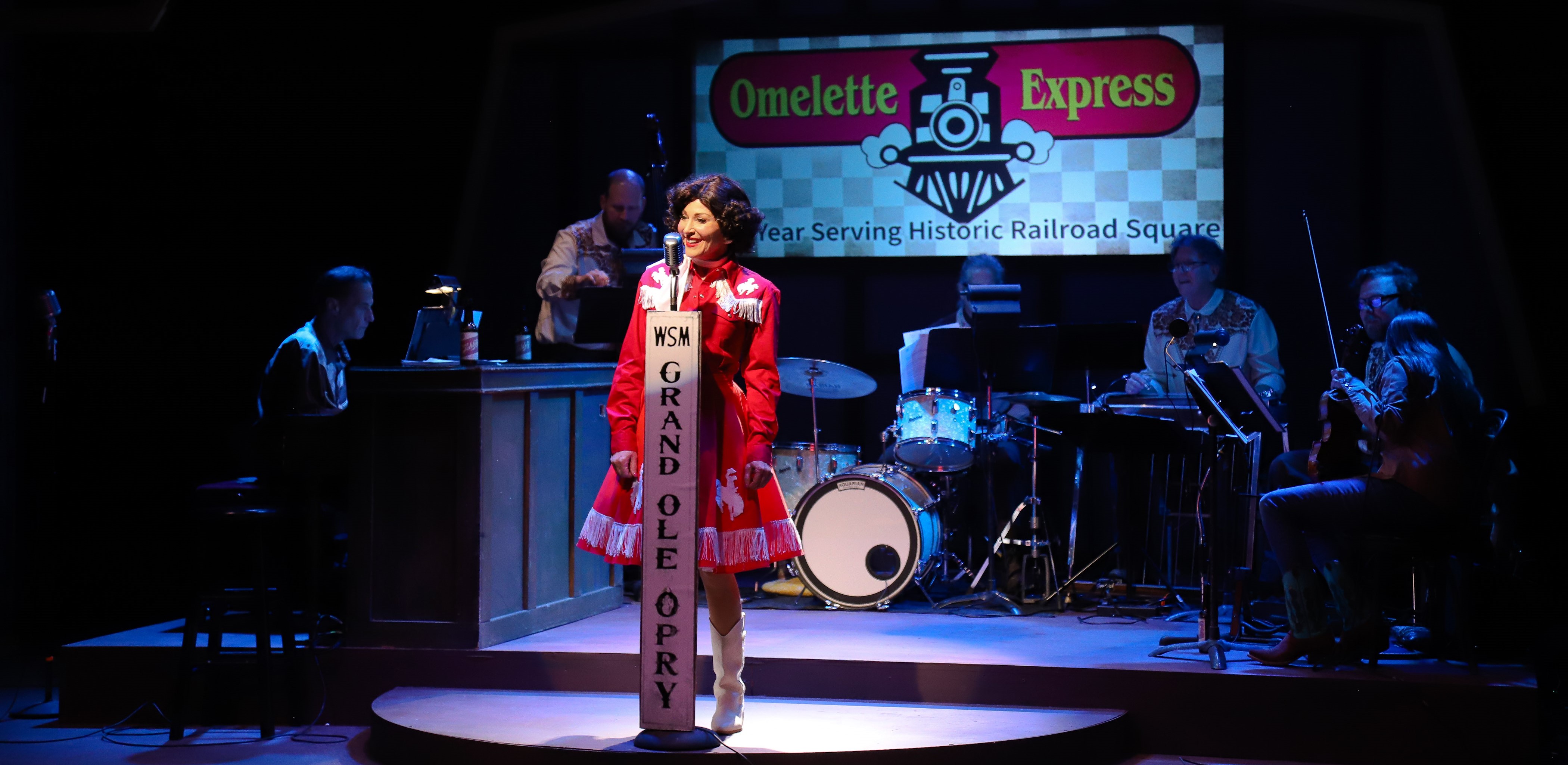 What detracts from that sense is the introduction of on-stage advertising to the Playhouse. It’s tough to mentally transport yourself to the Grand Ole Opry in 1961 when a slide show featuring local restaurants and businesses is prominently displayed behind the band. The shout-out to a local country radio station from Louise didn’t help either. In these financially-trying times for all, it’s understandable that theatre companies would seek additional sources of revenue but the obtrusiveness of this approach really takes one out of the world of the show. At the very least, the use of a graphic designer to create ads in the style of the era might help them blend better into the scenery.