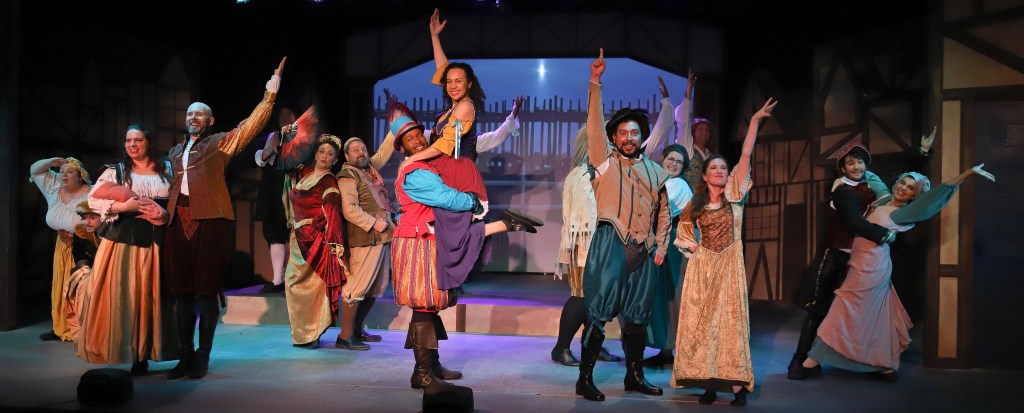 The key to the success of this exceedingly enjoyable show is the affection the show’s original creators (John O’Farrell and Karey & Wayne Kirkpatrick) have for the source material. It honors the work of Shakespeare and Broadway musicals while good-naturedly sending them both up. Every musical theatre trope is in play, from a flashy opening number (“Welcome to the Renaissance”) boisterously delivered by the Minstrel (Jonathen Blue) and ensemble through a hilarious paean to “The Black Death” to the musical moral of the show (“To Thine Own Self”).