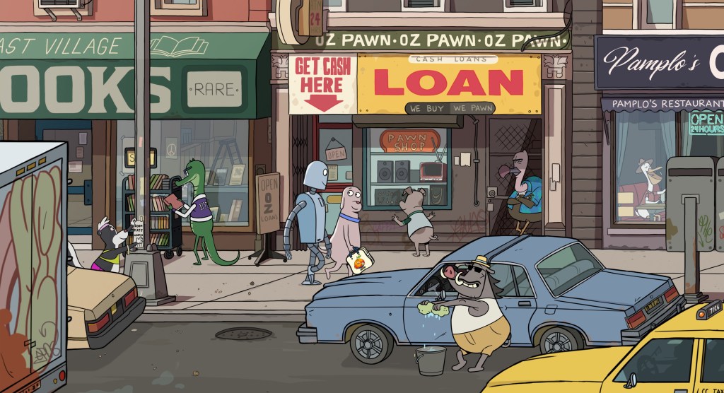 Robot Dreams, a 2D animated film from Spanish director Pablo Berger, is among the most beautiful films I’ve seen all year, a delightfully designed, essentially wordless, 102-minute film set in a fantastical animal-occupied version of 1980s New York City. It follows a lonely dog, living alone in an East Village apartment, who one night impulsively purchases a make-your-own robot kit he sees in an infomercial on television. Once the humanoid buddy has been delivered and assembled, Robot and Dog quickly become BFFs, as Dog introduces Robot to the joys of roller skating in Central Park, watching fireworks over the city, seeing The Wizard of Oz, walking together down the action-packed streets of Manhattan, and playing on the beach in the sun.