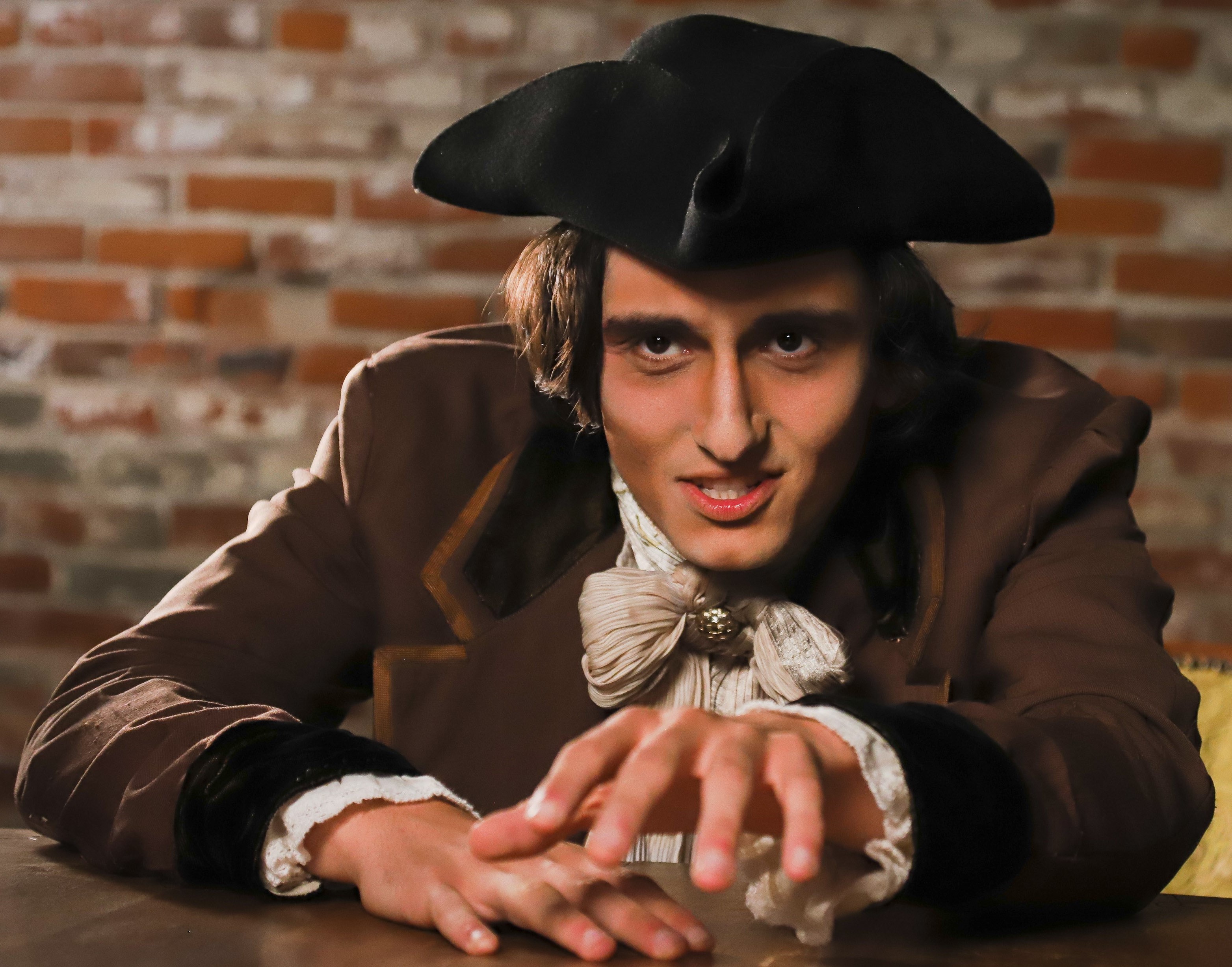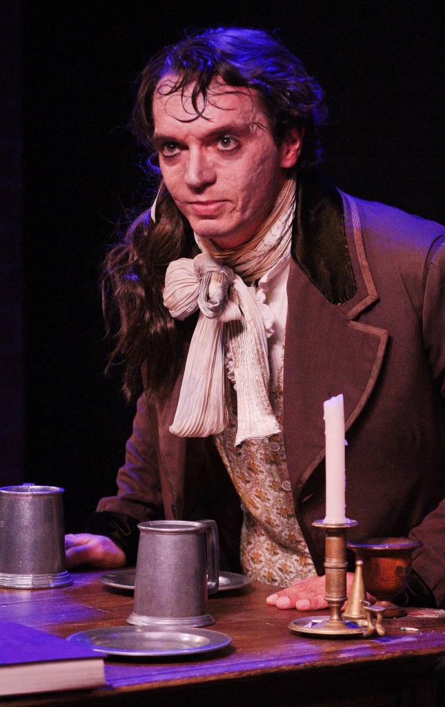 Closer in spirit to Walt Disney’s 1949 animated featurette than Tim Burton’s 1999 gorefest, Minigan’s approach is 100% old-fashioned storytelling. Set in a nameless New England tavern, Evans enters and introduces himself as Washington Irving. He engages with the audience as if they were fellow tavern-goers and soon begins the telling of the tale.
