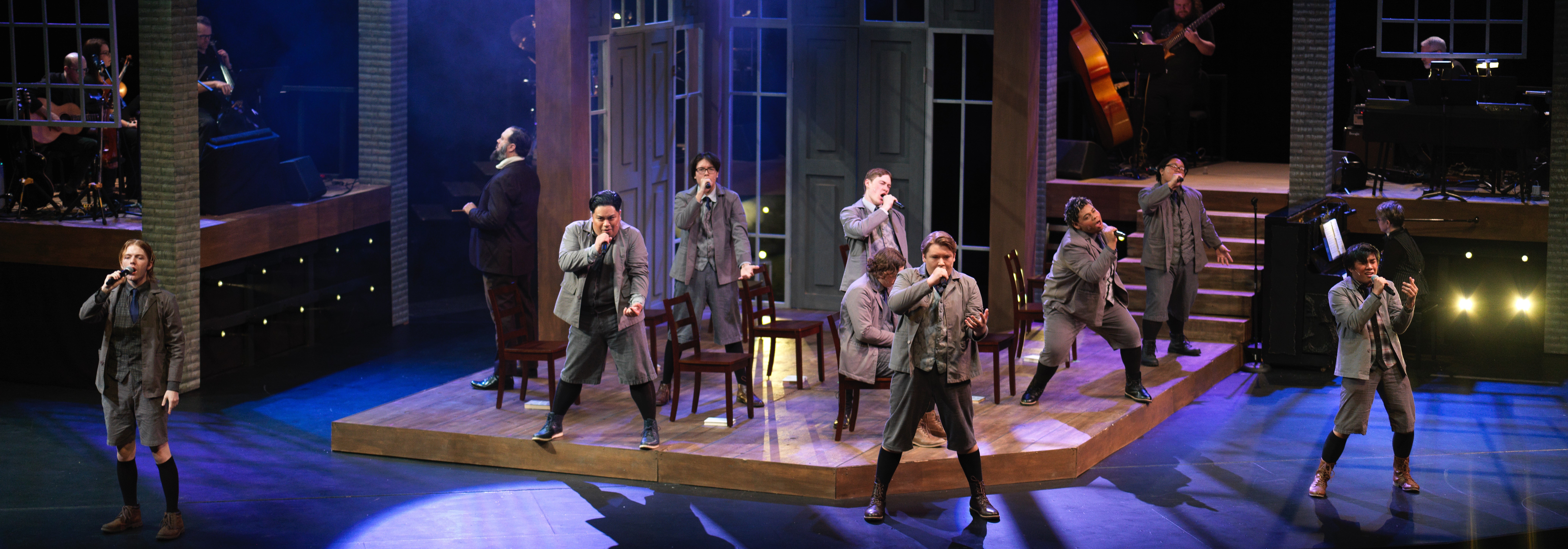 Director King’s choice to have the cast use hand-held mics and mic stands for many numbers added an unnecessary touch of American Idol to the proceedings that, while it may resonate with younger audiences, does subtract from the show’s overall tone. The fine vocal work done sans those mics in the last three numbers (“Whispering”, “Those You’ve Known”, “Song of Purple Summer”) proved they were unnecessary.
