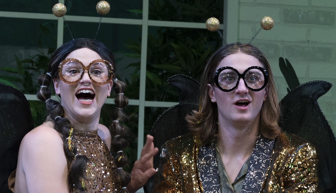 The utilitarian set by Nathaniel George Gillespie allows for quick scene changes and crisp projections (also by Gillespie) announce each play. The cast is well-supported by the lighting and sound designs by Alex Clark and Grace Reid. If you’ve ever wondered what mayflies on the make look like, costume designer Reynalda Cruz gives them a Las Vegas lounge singer look (with antennae).
