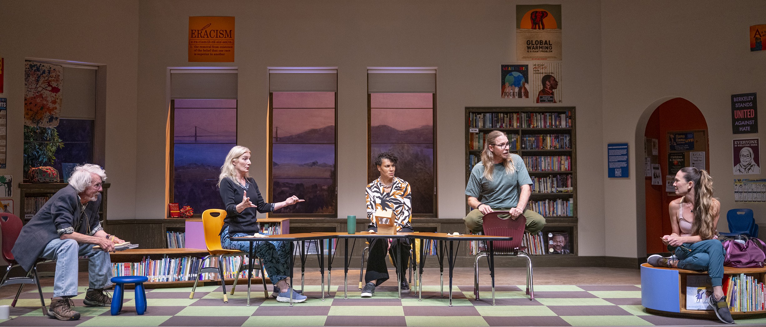 Kudos to Richard Olmsted, who designed the colorful set adding zest and humor to the play. The little children’s chairs and politically correct posters on the wall touting social justice set the tone.
