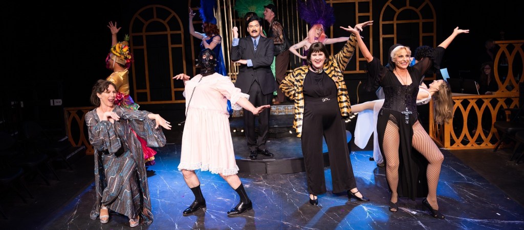 La Cage aux Folles is a madcap romp with zippy dancers in trippy costumes. It’s a drag nightclub, where genders are blurred by shiny costumes and lots of mascara. Harrie Schaufel, Phi Tran, and Lily Metcalf show off saucy moves choreographed by Alex Gomez with a live band directed by award-winning Debra Chambliss. They introduce the show’s theme song “We Are What We Are” with wigs and a whole lot of chutzpah.