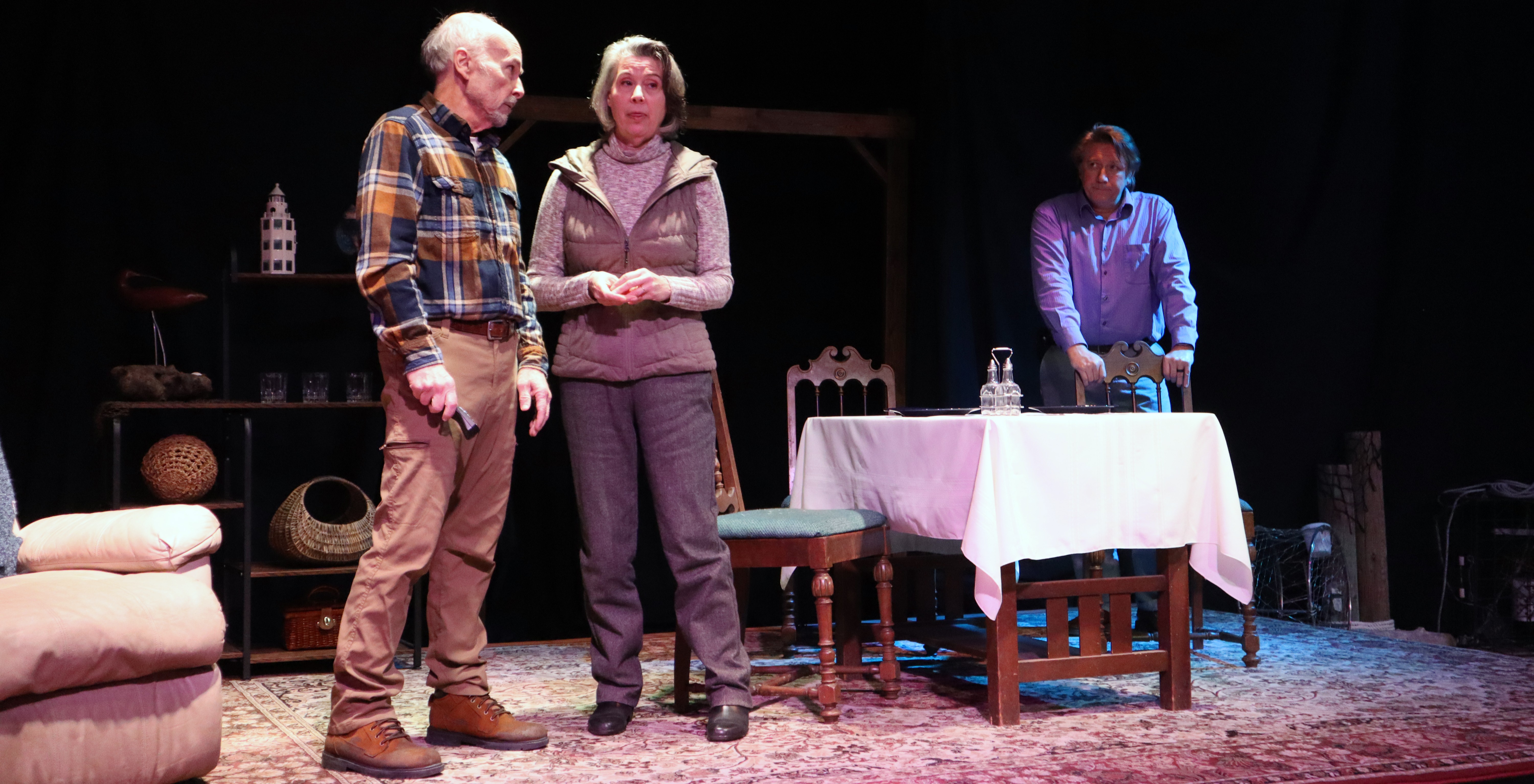 Two men are conversing while one of them fishes off of a Chesapeake Bay dock. The fisherman regales the stranger with tales of fishing with his son. The stranger seems somewhat confused by the conversation. A woman soon approaches. As they converse, we learn they’re not strangers at all. They’re a family. So begins Bruce Graham’s The Outgoing Tide, now running at the Cloverdale Performing Arts Center through February 1.