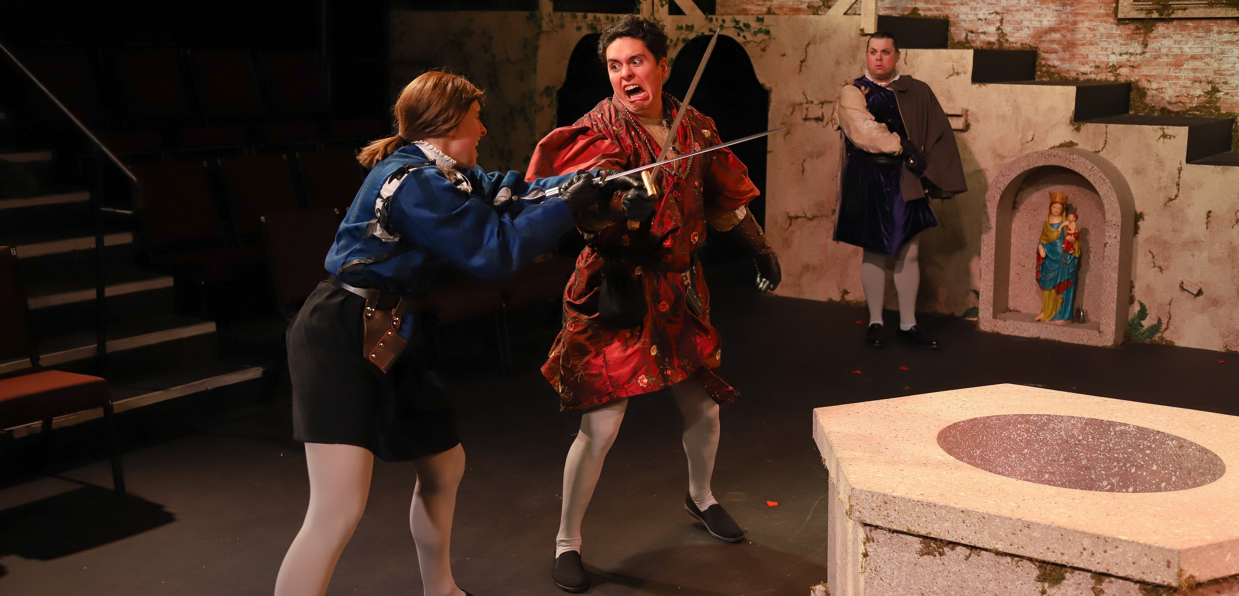 Some clever set design by Laurynn Malilay forces the traditional concept to work in the small space. Similarly, fight coordinator Noah Lucé had his work cut out for him, bringing the intense fights to a size that was safe enough for the very intimate space. That he did so is a testament to his talent.