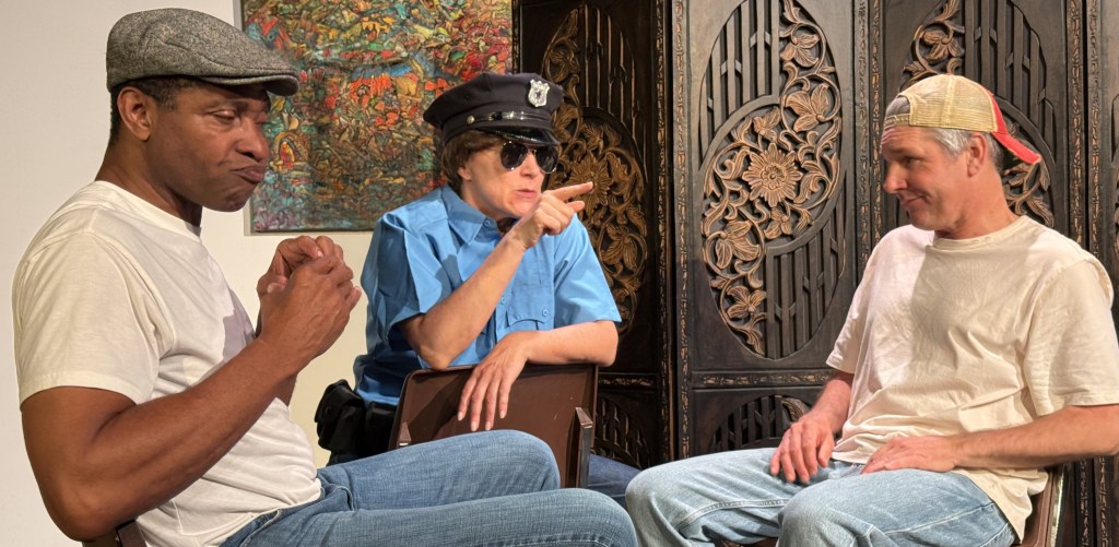 Issues of poverty, political opportunism, and especially racism are wrapped in humor in this typical bare-bones 222 production. The “set” consists of three chairs and a backdrop behind which Burboeck does multiple quick changes. That means it’s up to the cast to convey a sense of place and time and director Jeff Bracco has three top talents at work here.