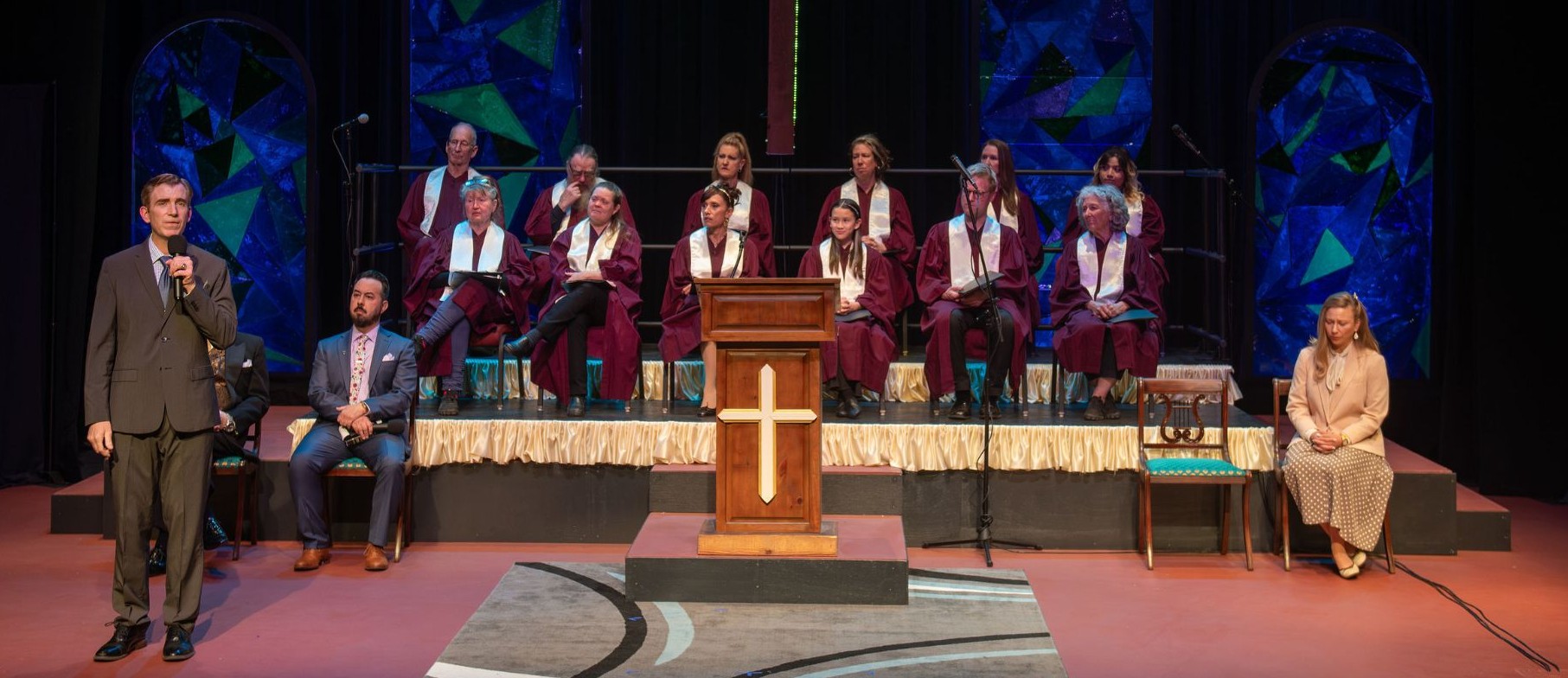 Folks walking into the usually sterile Warren Theater may be surprised by the large crucifix, draping cloths, and stained glass “windows” now occupying the stage. That stage is soon to be occupied by a 12-member choir and a couple of pastors tending to an unnamed megachurch in an unnamed state.